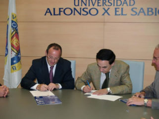 El presidente de la Universidad Alfonso X el Sabio, D. Jesús Núñez Velázquez, y el rector de la Universidad, D. José Domínguez de Posada, junto con el Sr. D. Joaquín Montenegro Grau y el Sr. D. Manuel Vilches Martínez, director general de Hospitales NISA y director del Hospital NISA Pardo de Aravaca, respectivamente, han firmado un convenio marco de colaboración. (En la foto, D. Joaquín Montenegro Grau, director general de Hospitales Nisa y D. Jesús Núñez Velázquez, presidente de la UAX)